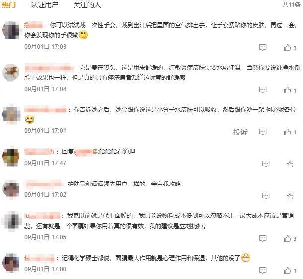 這句話,真是後勁大,內涵多,小柴讀一次,都能讀出不同的含義……然後這博主的評論區就活了,人感滿滿!「這是用來舒緩的,紅敏炎症皮膚需要水霧降温。當然你要説純淨水倒臉上效果也一樣,但是真的只有痤瘡患者知道這玩意的舒緩感」「這是小分子水皮膚可以吸收”「護膚品和遙遙領先用户一樣的,會自我攻略」