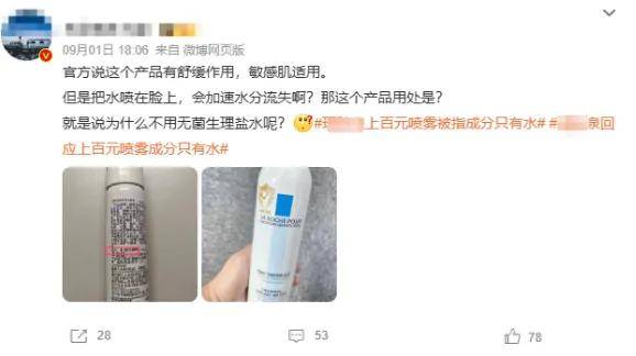 還有網友則表示:「官方説這個產品有舒緩作用,敏感肌適用。但是把水噴在臉上,會加速水分流失啊?那這個產品用處是?就是説為什麼不用無菌生理鹽水呢?」