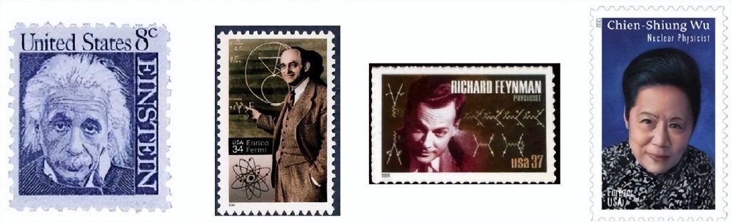 美國郵政局發行的郵票,從左到右分別為:愛因斯坦、費米、費曼、吳健雄