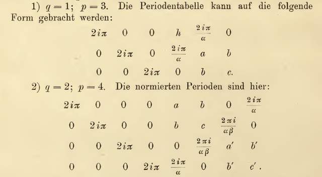 如果一個給定的阿貝爾函數系統S,它可以約化(reduce)為第二個系統S’,並且如果S和S’都是從代數曲線C和C’中產生的,那麼在曲線上的點的變換羣之間可建立代數對應;只考慮C中的一個點對應C’中的一個點,而C’中的一個點對應n個C中的點的情況。這樣就存在着某些屬於C的可還原積分,其週期表(the table of periods / Periodentabelle)有一個簡單的標準形式(normal form)。