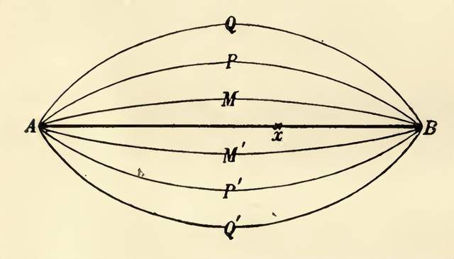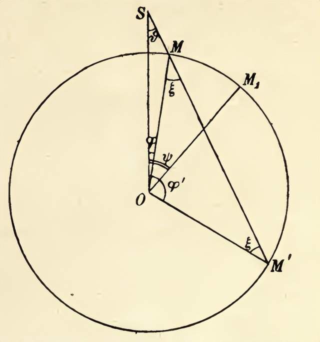 龐加萊對球體表面波傳播的幾何關係分析圖(摘自原書第27頁)。