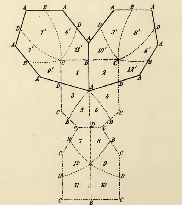 對一個例子(p=2, q=1, n=2)的富克斯羣,龐加萊對其所對應的基本域進行的圖示説明(摘自原書第40頁)。