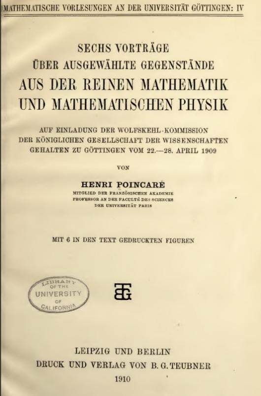 譯者按:1909年4月,龐加萊受希爾伯特(Hilbert)之邀,在沃爾夫斯凱爾基金會(Wolfskehl-Stiftung)贊助下(希爾伯特時任該基金委員會主席),在哥廷根進行了一系列講座,這也是首屆沃爾夫斯凱爾講座。講座的主要內容後被收入《關於純粹數學和數理物理學中選定課題的六次講座》(Sechs Vorträge über ausgewählte Gegenstände aus der reinen Mathematik und mathematischen Physik, Leipzig and Berlin, Teubner, 1910. 8vo. 60 pp)一書。