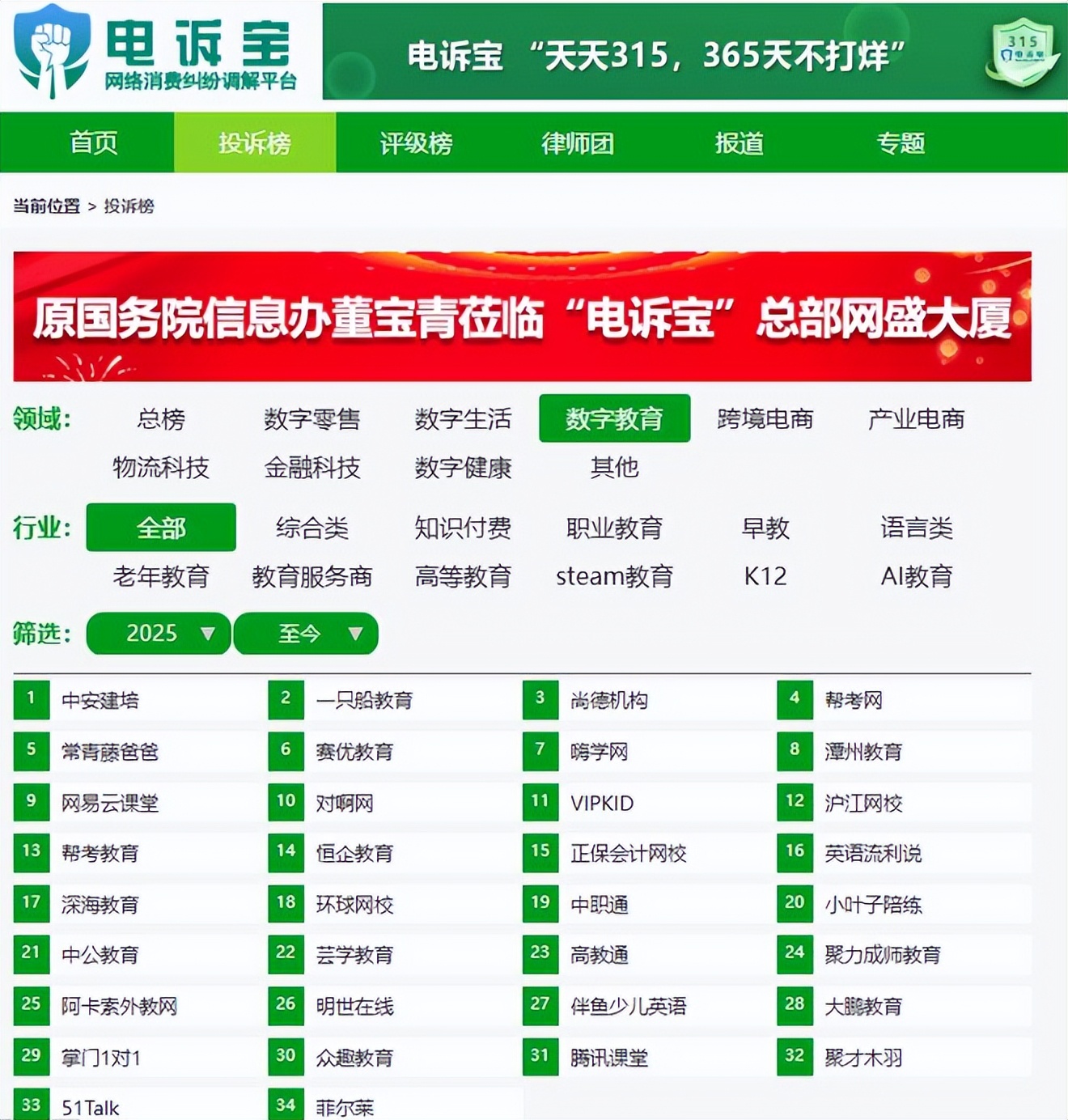 據網絡消費糾紛調解平台“電訴寶”顯示,2025至今,“電訴寶”受理投訴中涉及的數字教育平台按投訴量依次為:中安建培、一隻船教育、尚德機構、幫考網、常青藤爸爸、賽優教育、嗨學網、潭州教育、網易雲課堂、對啊網、VIPKID、滬江網校、幫考教育、恆企教育、正保會計網校、英語流利説、深海教育、環球網校、中職通、小葉子陪練、中公教育、芸學教育、高教通、聚力成師教育、阿卡索外教網、明世在線、伴魚少兒英語、大鵬教育、掌門1對1、眾趣教育、騰訊課堂、聚才木羽、51Talk、菲爾萊。