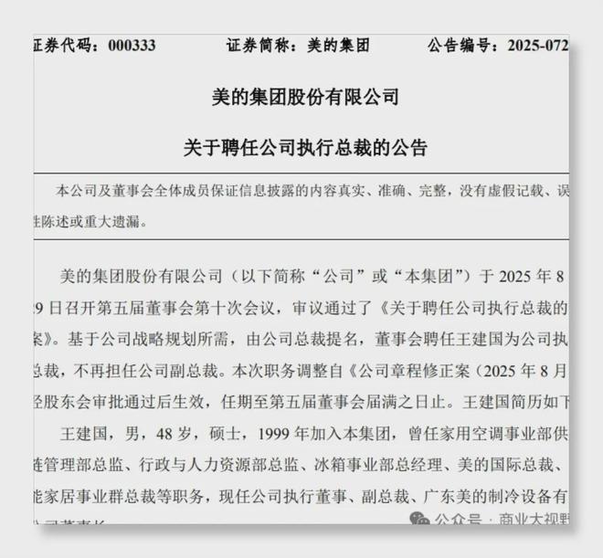 美的集團在8月底發佈的《關於聘任公司執行總裁的公告》顯示,經總裁提名,董事會決定聘任王建國為公司執行總裁,同時他不再擔任副總裁職務。這一任命要在《公司章程修正案(2025年8月)》經股東大會審議通過後生效,任期到第五屆董事會屆滿為止。這可不是一次普通的人事調動,“執行總裁”這個職位,是自2012年方洪波接任美的集團董事長以來首次設立,背後的深意,耐人尋味。