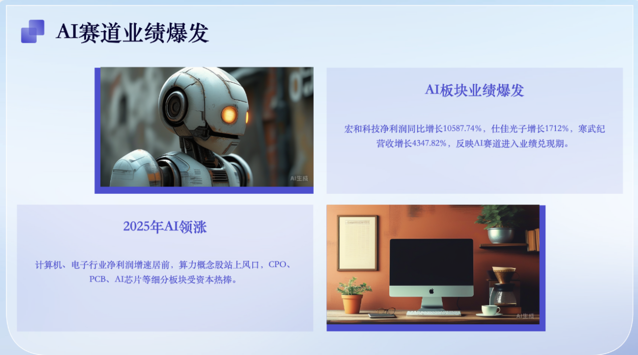 2025年的A股市場,AI板塊無疑是最閃亮的明星。按照申萬一級行業分類,計算機、電子等行業淨利潤增速居前。在AI大浪潮下,算力概念股站上風口,共封裝光學(CPO)、印製電路板(PCB)、AI芯片、液冷等細分板塊成為資本追逐的賽道。