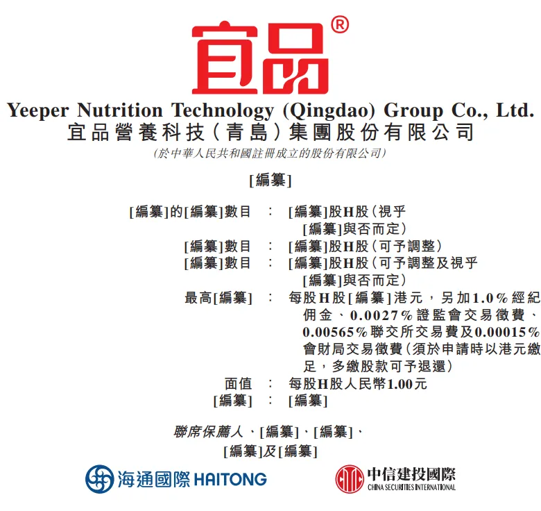 據港交所8月31日披露,宜品營養科技(青島)集團股份有限公司向港交所主板遞交上市申請,海通國際、中信建投國際為聯席保薦人。