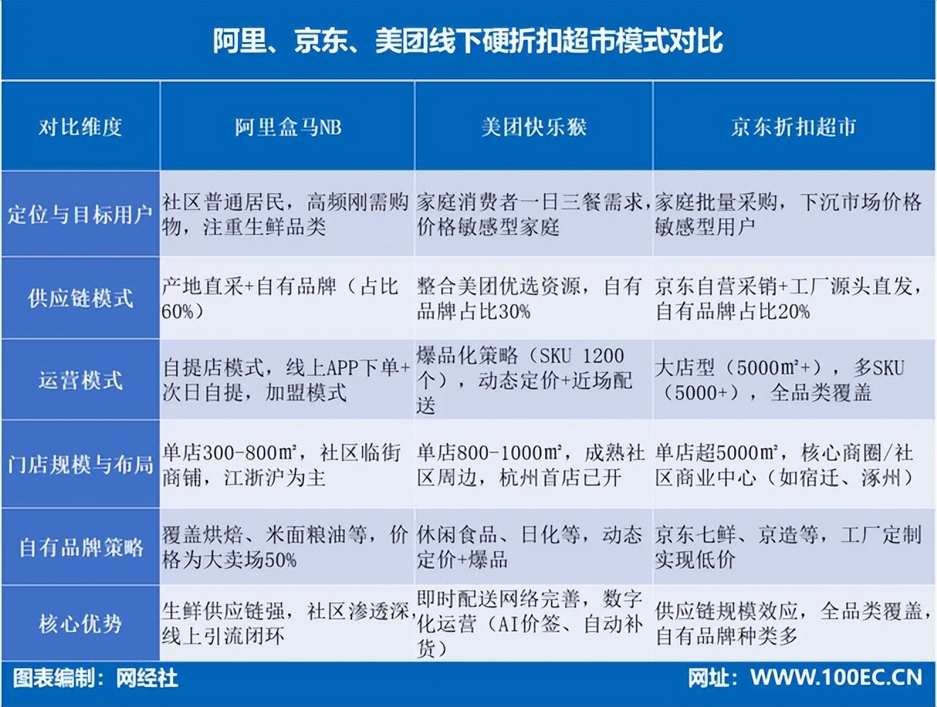 天使投資人、網經社電子商務研究中心特約研究員郭濤認為,京東以供應鏈深度整合為核心,通過規模化集採+自建倉儲掌控成本;美團依託本地生活流量入口,採用輕資產加盟模式快速鋪開網點;阿里則聚焦生鮮品類,借盒馬NB構建“基地直供+自有品牌”閉環。三者差異在於:**京東重資產控盤標準品,美團依賴地推裂變搶佔下沉市場,阿里以生態協同強化生鮮壁壘,**形成錯位競爭格局。