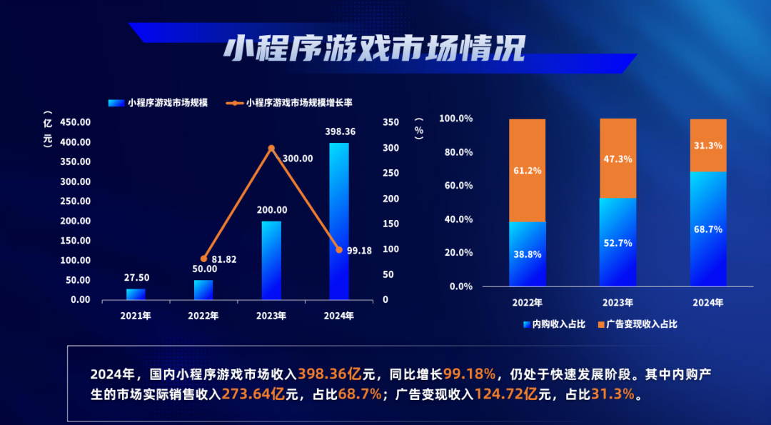 《2024年中國遊戲產業報告》顯示,2024年國內遊戲市場銷售收入3257.83億元,同比增長7.53%;其中,小遊戲市場銷售收入為398.36億元,同比增長99.18%,仍處於快速發展階段。