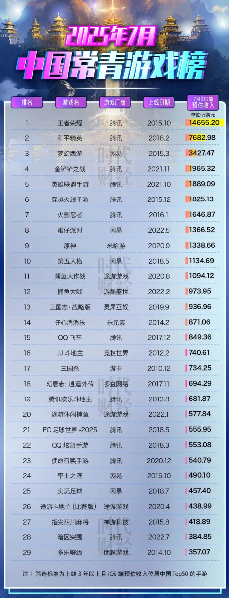網易雖然效仿騰訊走長青遊戲的路線,但兩者的差距肉眼可見,《2025年7月中國常青遊戲榜》顯示,騰訊共有12款遊戲上榜,網易僅有5款;TOP 5中,騰訊佔據四席,網易僅有一席。