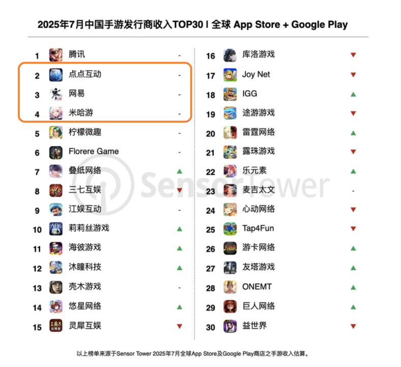Sensor Tower的數據顯示,2025年7月中國手遊發行商全球收入總榜,騰訊、點點互動、網易與米哈遊位居前四,位次沒有變化。