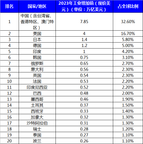 表中為世界2023年世界工業產能前20名的國家。能發現一些很有趣的規律。