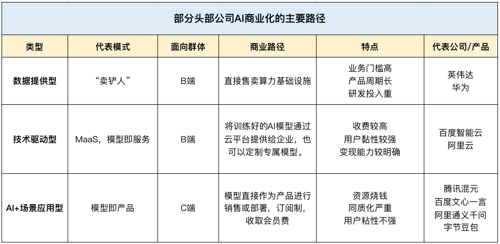頭部企業基於自身資源和業務基礎,選擇了不同的AI商業化路徑,目前大致可以分為幾類模式,部分交叉並存。