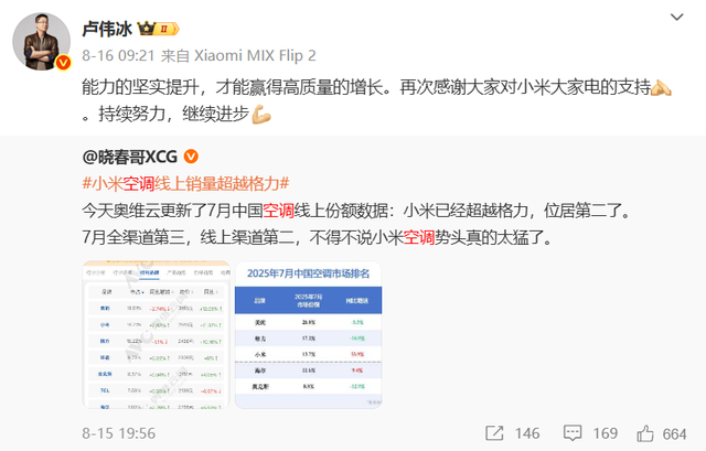 這次格力和小米的爭論,起因是盧偉冰轉發了一條小米已經超越格力,位居第二了的博文。