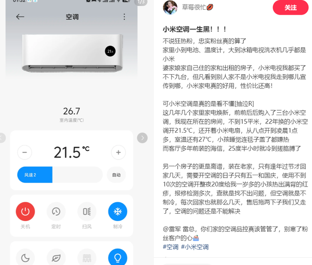 還有網友稱前前後後購入了三台小米空調,房間不到15平米,22年換的小米空調開21.5℃,還開着小米電扇,從八點開到凌晨1點多,室温還有27℃,小孩睡覺連毯子蓋了都嫌熱。