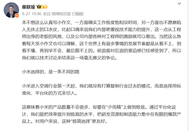 對於格力朱磊的技術討論,王化選擇了打油詩回應,單聯瑜的回應相比王化更加專業,但是也加入了很多嘲諷及追捧小米高管的話術。