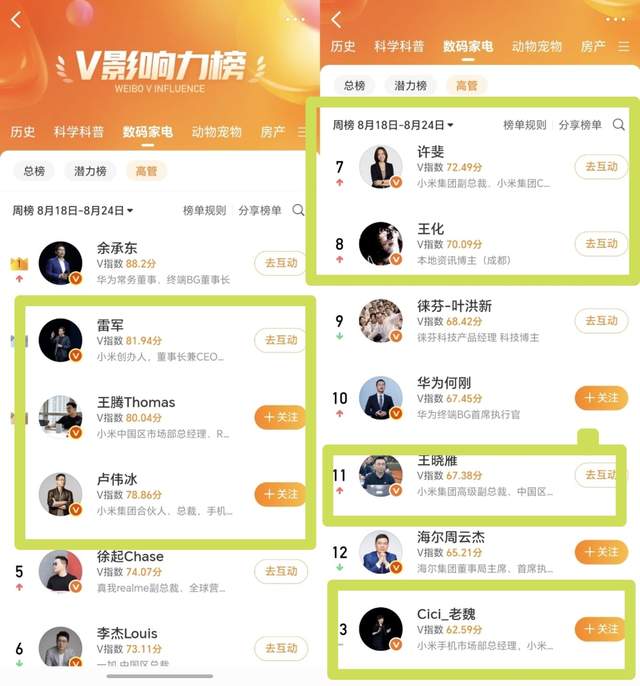 在微博影響力高管榜單上可以看到,前13名中小米高管佔了7名,包括雷軍、王騰、盧偉冰、許斐、王化、王曉雁、老魏,足以見得小米在微博上的影響力。