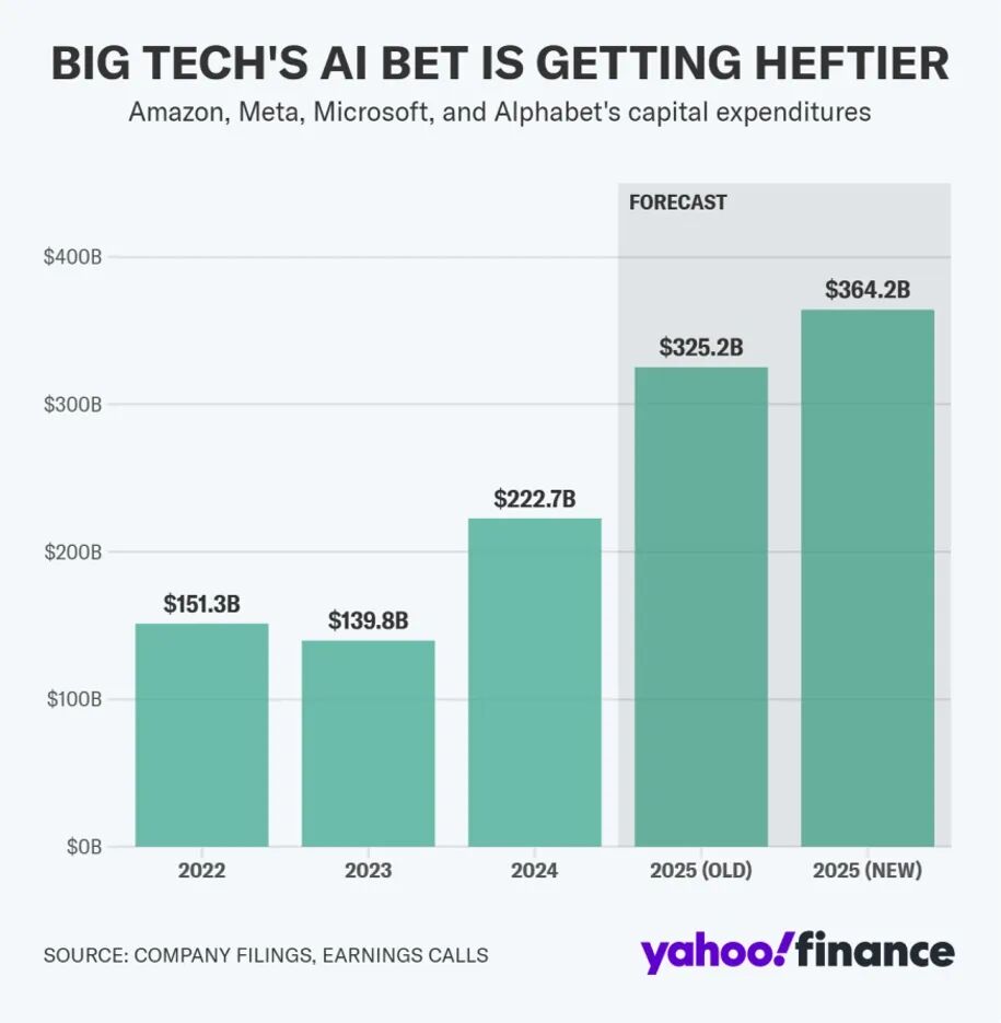 yahoo.finance數據顯示,上述四家科技巨頭在AI領域的投資正在加大,單在2025年就預計超過3500億美元,超過前期3250億美元的估值。