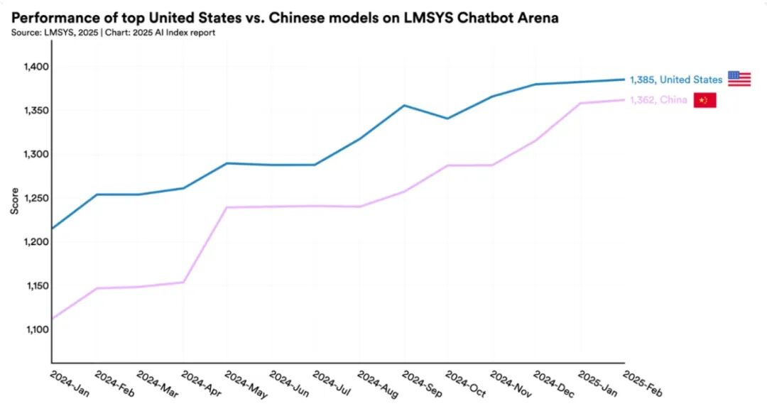 斯坦福《2025人工智能指數報告》顯示,2023年中美頂級模型性能差距曾在多個基準測試上高達數十個百分點,而2024年這一差距已迅速收窄至個位數,部分指標僅差距0.3個百分點。