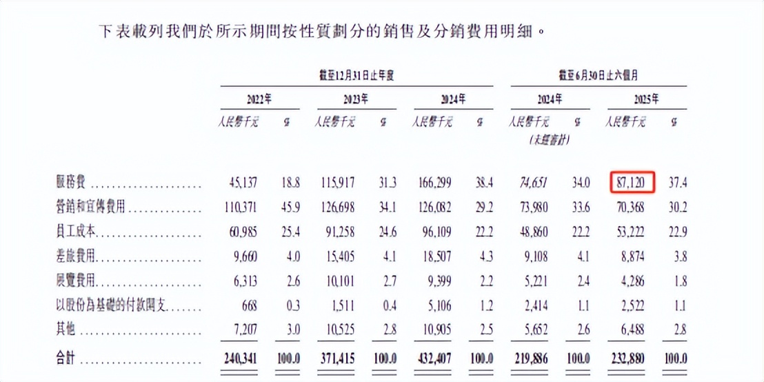 穿透其成本結構也可發現,銷售及分銷服務費用的激增同樣拖累了其盈利指標,尤其是線上渠道的開拓。財報顯示,公司向電子商務平台合作伙伴支付的佣金和平台服務費從2022年0.45億元大幅增至2024年的1.66億元,今年上半年又較去年同期的0.75億元有所增加,達0.87億元。
