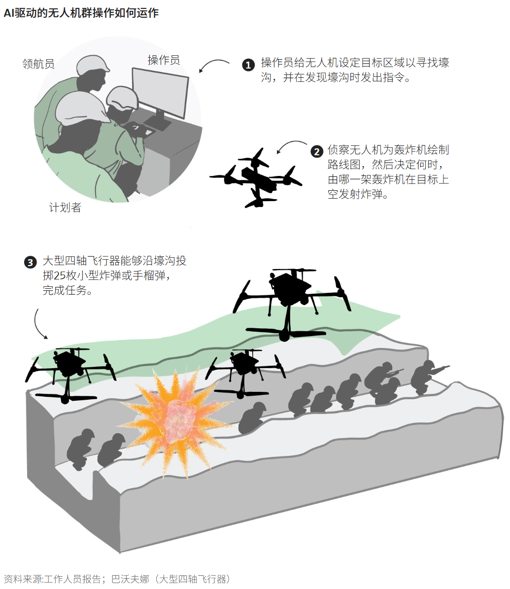 作戰流程通常是這樣的:一架偵察無人機進入目標區域尋找俄軍陣地,其他兩架搭載小型炸彈的無人機在後方待命。一旦發現目標,偵察機便將信息傳輸給同伴,由它們自動判斷何時、由誰進行攻擊。整個過程中,人類只負責設定目標區域和發出“可攻擊”的指令,真正的執行時機和方式,全由機器判斷完成。這不僅極大減少了對人力的需求,也顯著提高了反應速度和作戰效率。據這位軍官介紹,使用蜂羣系統的任務只需三人配合,而不用這種系統的話,可能需要多達九人蔘與。