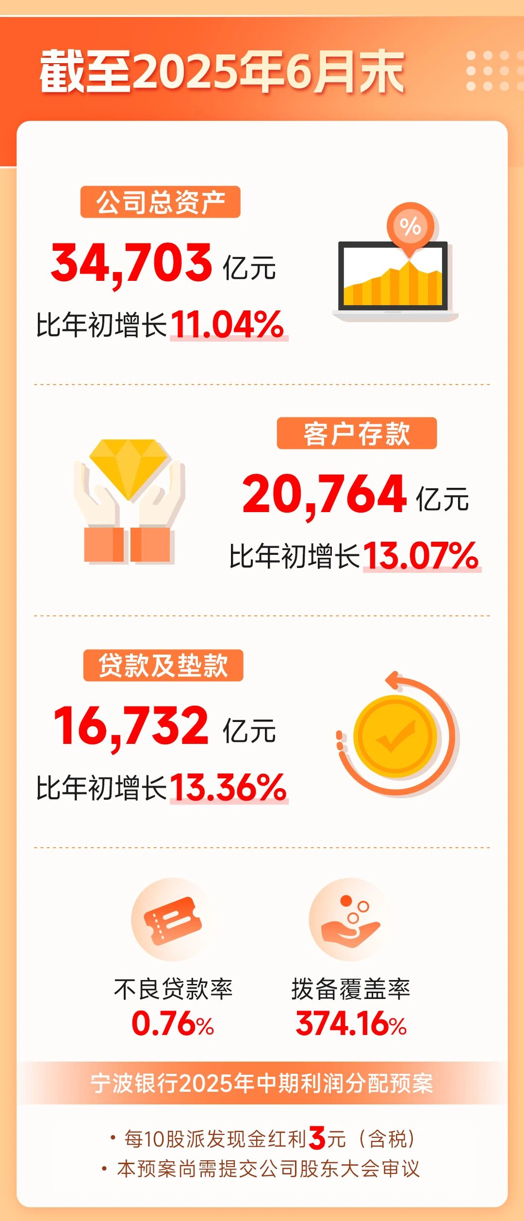8月28日晚間,寧波銀行正式對外披露2025年半年報,截至6月末,寧波銀行總資產突破3.47萬億元,比年初增長11.04%,上半年營業收入371.60億元,同比增長7.91%,實現歸屬於母公司股東的淨利潤147.72億元,同比增長8.23%,不良貸款率0.76%,資產質量繼續保持業內較好水平。公司同時公告2025年中期利潤分配預案,擬每10股派發現金紅利3元(含税)。