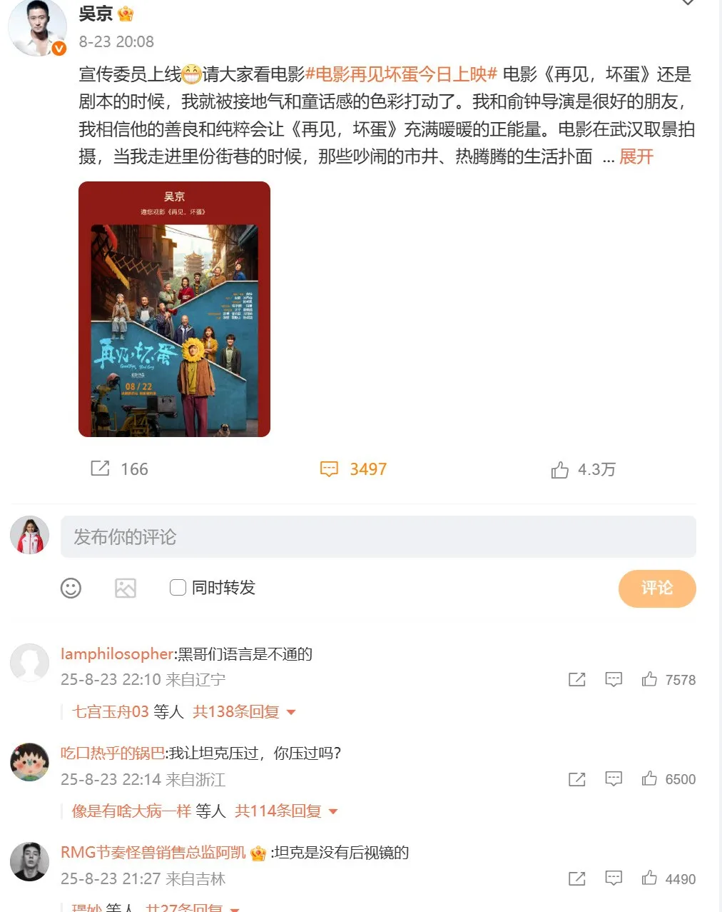 (吳京這次被嘲直接的導火索是他投資並客串的電影《再見,壞蛋》票房表現極為慘淡)