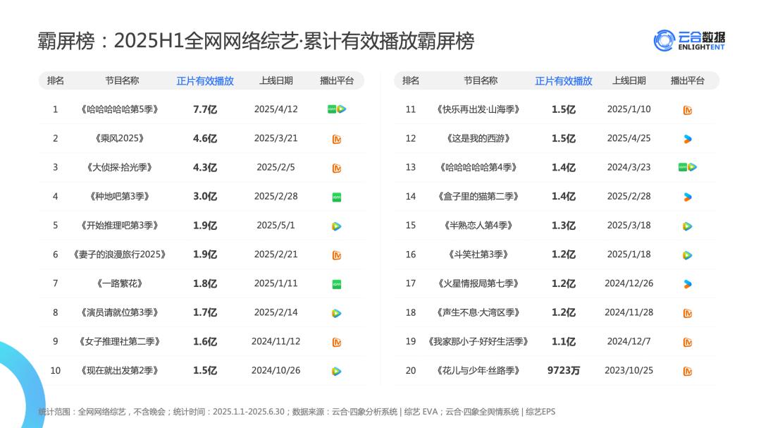 **相比之下,芒果TV的綜藝表現更為亮眼。**今年上半年播出的《大偵探·拾光季》《乘風2025》《女子推理社第二季》《聲生不息·大灣區季》《再見愛人第四季》等節目皆在播出當月的雲合綜藝正片有效播放市佔率排行榜榜上有名,且《大偵探·拾光季》市佔率登頂該榜2、3月榜首,《乘風2025》登頂4月榜單。