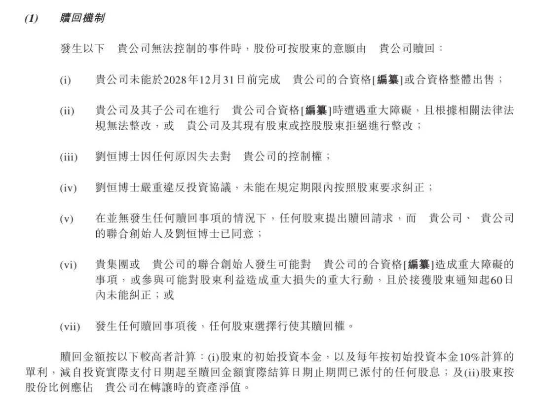 但投資方與企業也簽署了對賭協議,若公司在2028年12月31日前未完成上市或合格整體出售等條款,股東可要求公司贖回股份。