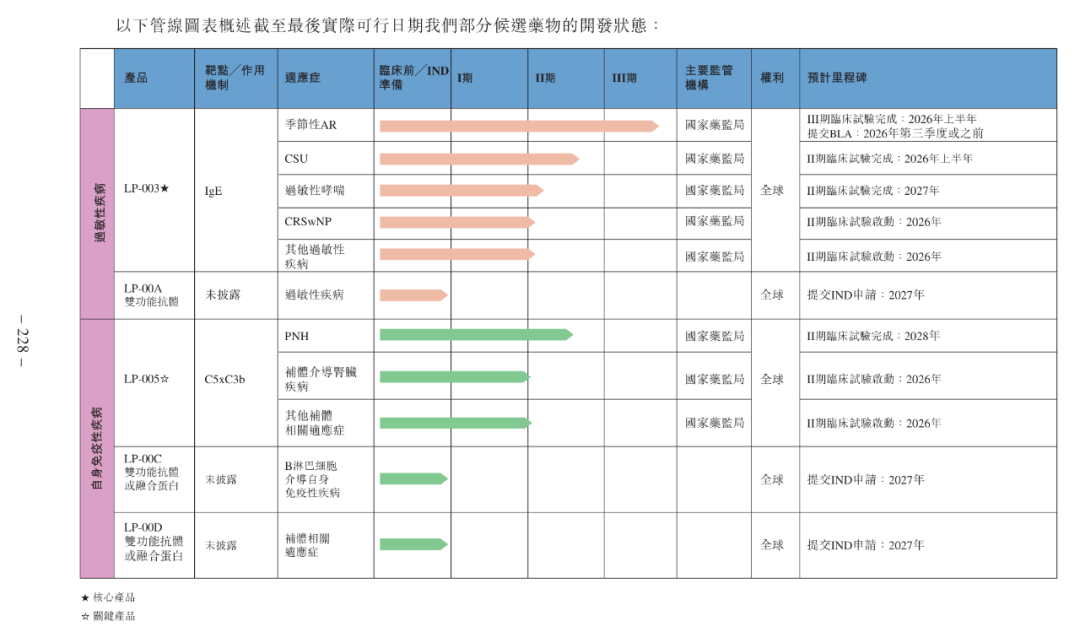 **但資本熱度難掩現實壓力,公司至今未盈利,核心產品均未商業化,**進展最快的核心產品下一代抗IgE抗體(免疫球蛋白E,一種參與過敏反應的抗體)LP-003用於季節性過敏適應症,要到2026年三季度才計劃提交上市申請。這意味着,公司在此之前仍需靠融資推進研發。