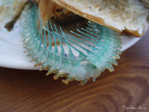在買魚的時候並不知道魚的種類,而吃魚時發現前段的魚骨顏色正常,但到中段則變成鮮豔的綠色,到後段亦有些許綠色,心感不安,於是發帖詢問這是怎麼回事。