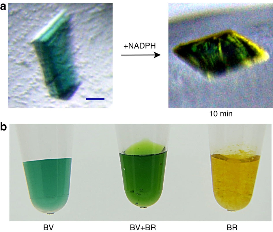 膽綠素還原酶可以將藍綠色的膽綠素催化轉化為黃色的膽紅素 圖源:文獻2