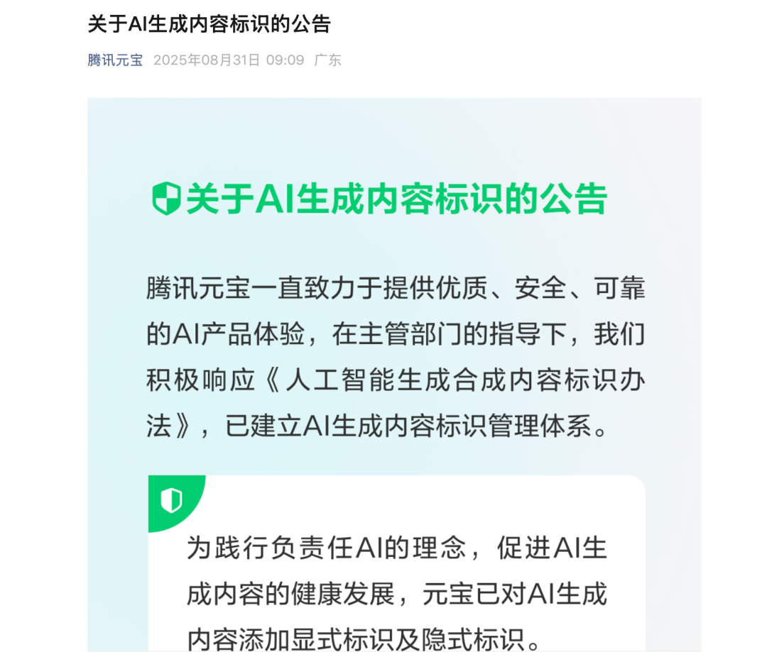 在大模型廠商紛紛“打標”的背後,是9月1日起正式實施的《人工智能生成合成內容標識辦法》。該《辦法》由國家互聯網信息辦公室、工業和信息化部、公安部、國家廣播電視總局四部門聯合發佈,要求所有AI生成的內容都要“亮明身份”。