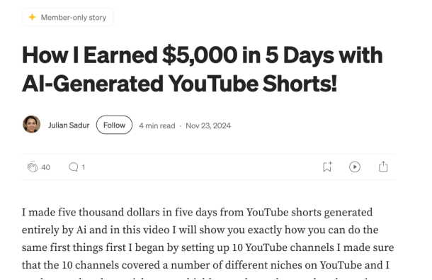 這背後當然是利益驅使,曾有人在Medium發文,表示利用AI短視頻,5天就賺了5000美元。