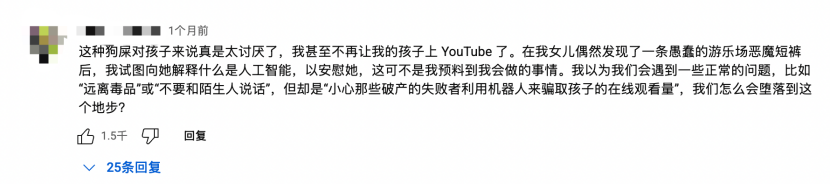 辨別能力有限的不止有老人,更不只是中國用户。YouTube上一位憂心忡忡的用户就分享説,自己的孩子看了一則短視頻,是關於“遊樂場惡魔”的,嚇得不輕。她不得不費勁給孩子解釋什麼是人工智能,最後乾脆禁止孩子再用YouTube。