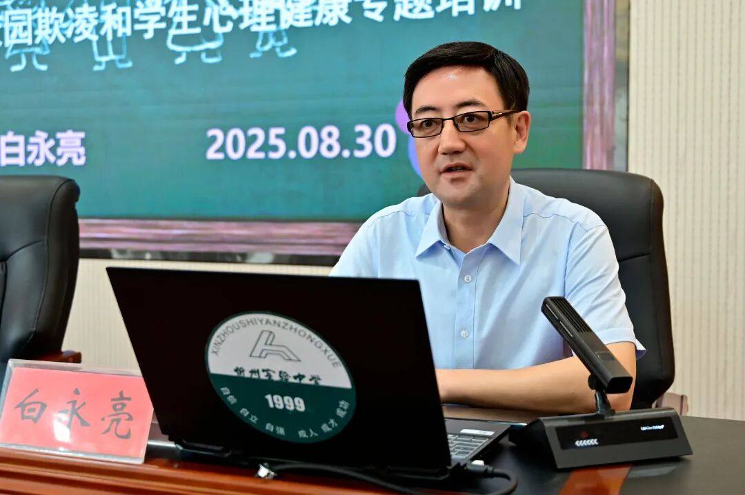 會議伊始,德育處主任白永亮作專題培訓,白永亮主任作為國家級心理諮詢師、市教育局校園安全專家,多次參與省、市各級安全教育培訓與評審工作,具備豐富的理論和實戰經驗。在前不久結束的山西省應急科普技能講解大賽中,白永亮主任單人代表忻州市榮獲優秀組第一名。本次培訓中,他以《堅持嚴細實恆,守住安全底線——新學期預防校園欺凌和學生心理健康》為主題,結合典型案例與智慧方法,深入剖析校園欺凌的成因與應對策略,為全體教師帶來了一堂實用性強、啓發性深的安全教育課。