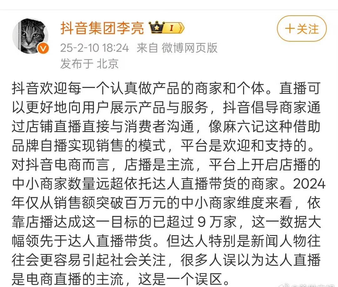 抖音歡迎每一個認真做產品的商家和個體,直播可以更好地向用户展示產品與服務,抖音倡導商家通過店鋪直播直接與消費者溝通,像麻六記這種藉助品牌自播實現銷售的模式,平台是歡迎和支持的。