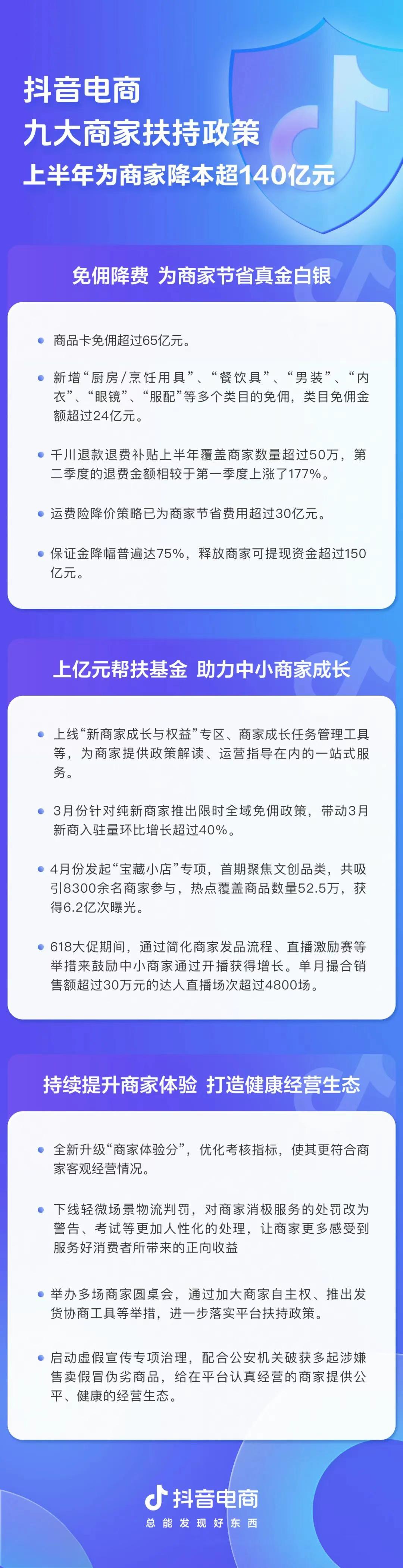 在商家扶持上,今年1-6月,抖音通過商品卡免傭、類目免傭、降運費險、返還推廣費、小商家幫扶基金等多項舉措,累計為商家節省經營成本超過140億元。僅在剛剛過去的6月份,單月就為商家減負30億元。降低保證金政策為商家釋放了超過150億元的可提現資金,大大提升了商家資金的靈活性。