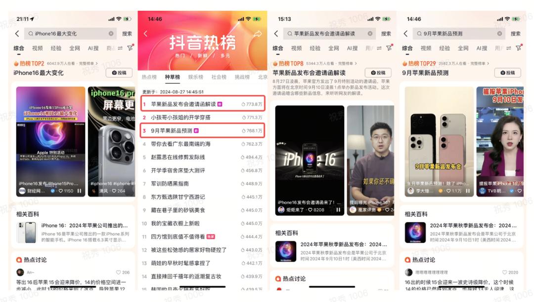 抖音官方披露,去年八月開始,抖音電商就已陸續出現與蘋果新品發佈會相關的熱點內容和話題。多個話題登上熱榜,其中#iPhone16最大變化 登頂全國熱榜第一位置,#蘋果新品發佈會邀請函解讀 成為種草榜Top1,#9月蘋果新品預測 #iPhone16首發搶購攻略 等話題詞也登上熱議榜單,整體曝光量超5.6億。