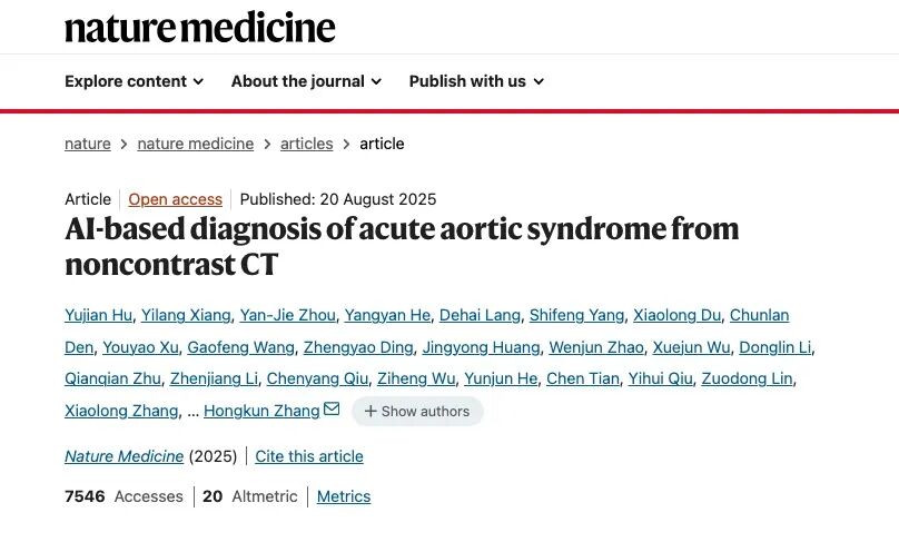 Nature medicine:AI-based diagnosis of acute aortic syndrome from noncontrast CT