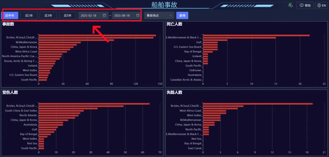 支持時間範圍查詢船舶事故,可選擇缺省日期近半月、近1年、近3年、近5年;也可通過時間組件自定義開始、結束時間。
