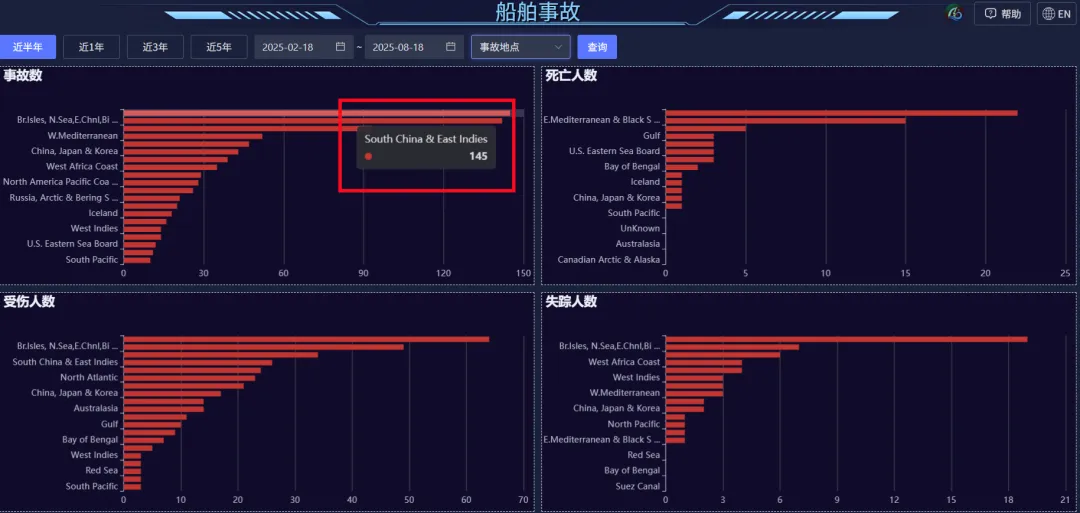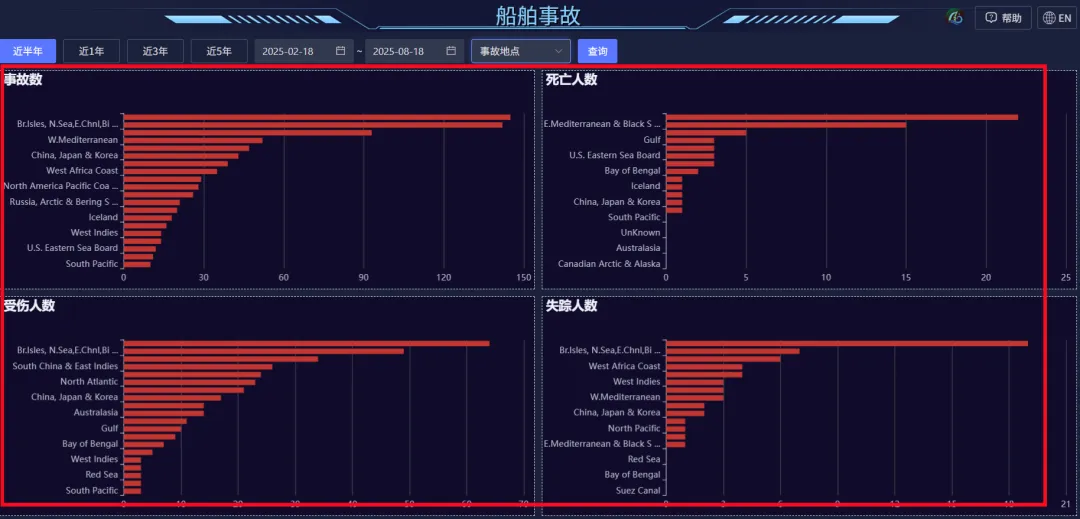 點擊查詢,生成四個橫向柱狀圖,統計的數據分別為:事故數、受傷人數、死亡人數、失蹤人數。
