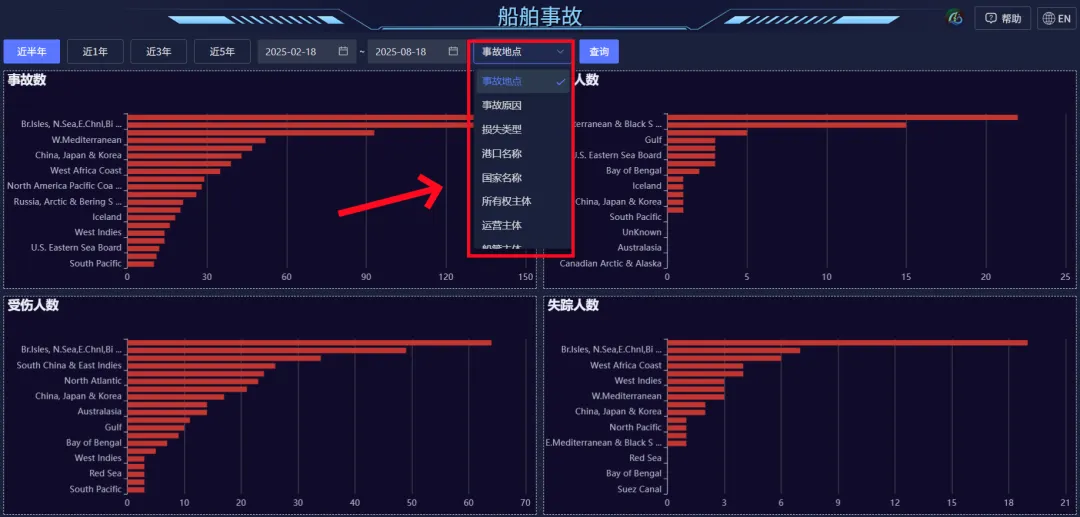 支持選擇船舶事故的統計維度,可選擇事故地點、事故原因等八個維度。