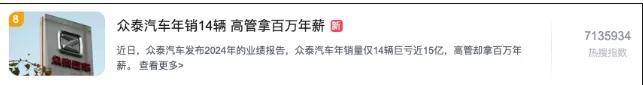 雖然連續虧損,但此前,眾泰汽車還因高管的鉅額年薪引發爭議。據媒體報道,年銷14輛的眾泰汽車,高管拿百萬年薪。