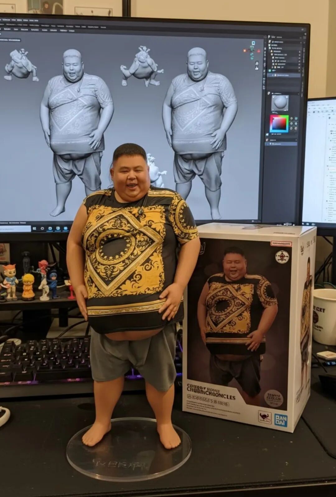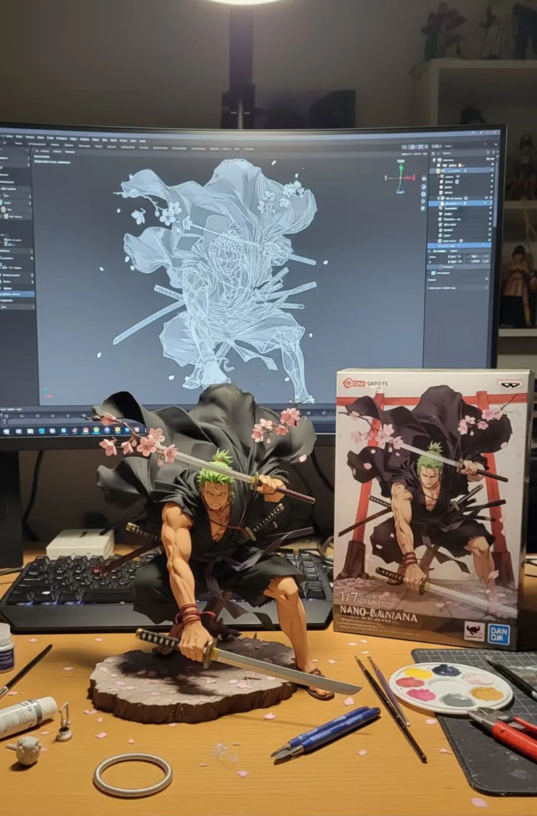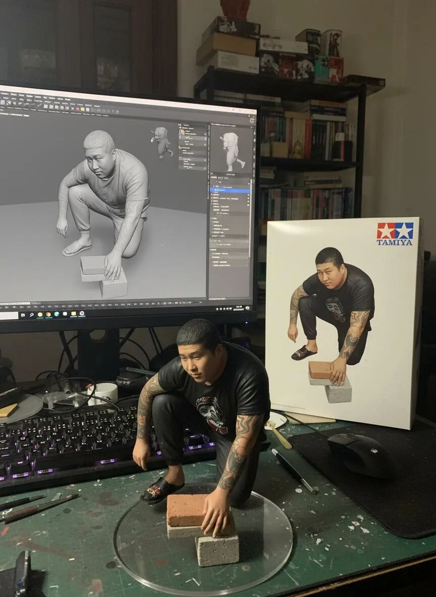 (中文版:使用nano-banana模型製作一個1/7比例的實體模型,風格和環境保持寫實。將模型擺放在電腦桌上,底座為圓形透明亞克力材質,且不帶任何文字。電腦屏幕上顯示的是該模型在ZBrush中的建模過程。在電腦屏幕旁邊,放置一個TAMIYA風格的玩具包裝盒,包裝盒上印有原始插畫。)