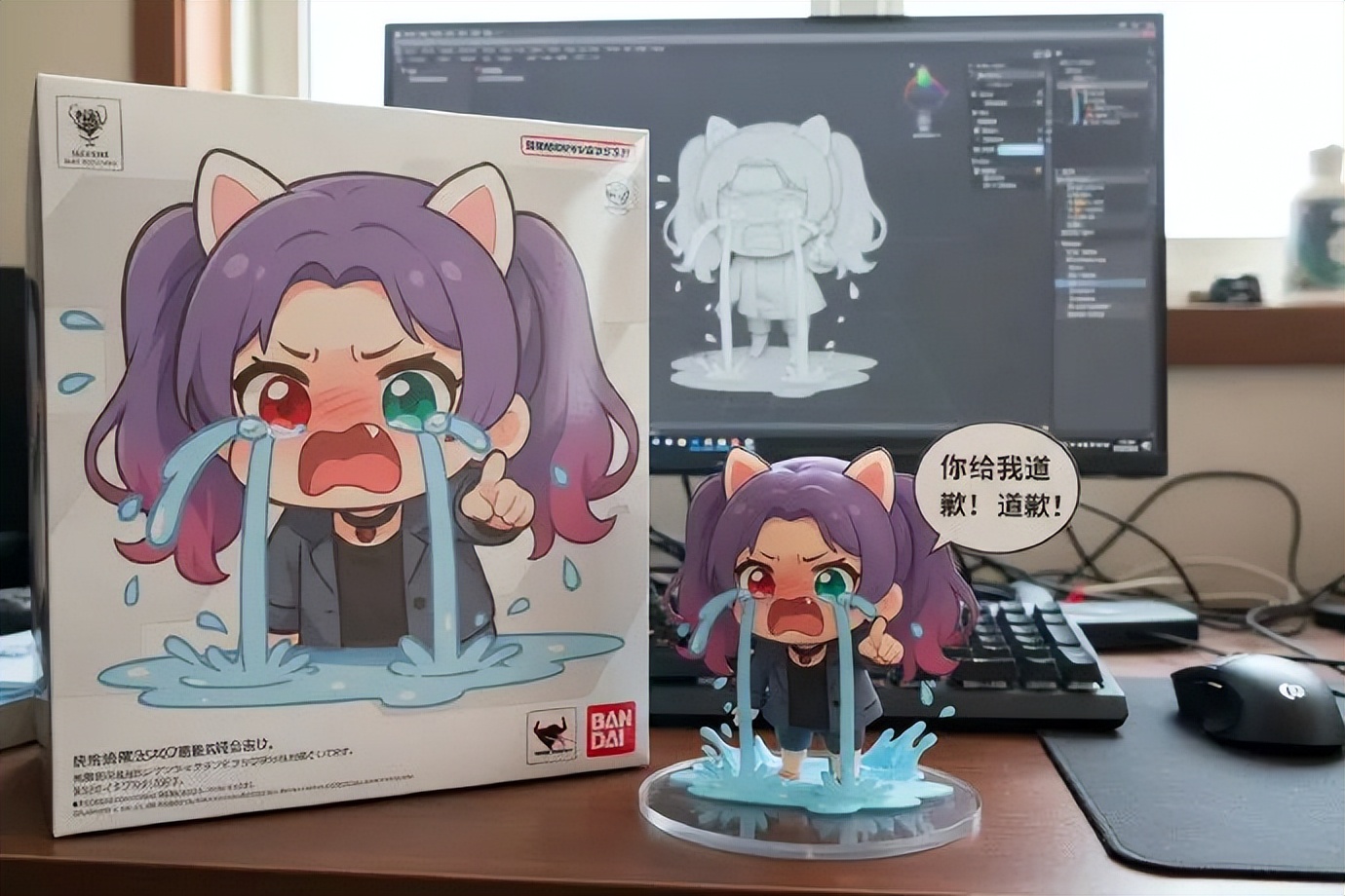 明顯能感受到,一些圖片的生成效果達到了以假亂真的水準,無論是手辦本身的材質、投射在地上的光影、背後的包裝盒,還是電腦屏幕裏複雜的建模軟件,丁真程度都很高,看不出AI生成的那種“油膩感”。反正我剛開始看到這些圖片的時候,確實有被騙到,誤以為是實物拍攝。
