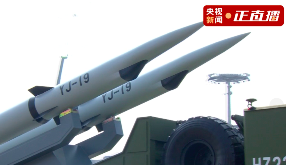 在海戰裝備方隊裏,幾款寫着YJ兩個字母的導彈格外引人注目。
