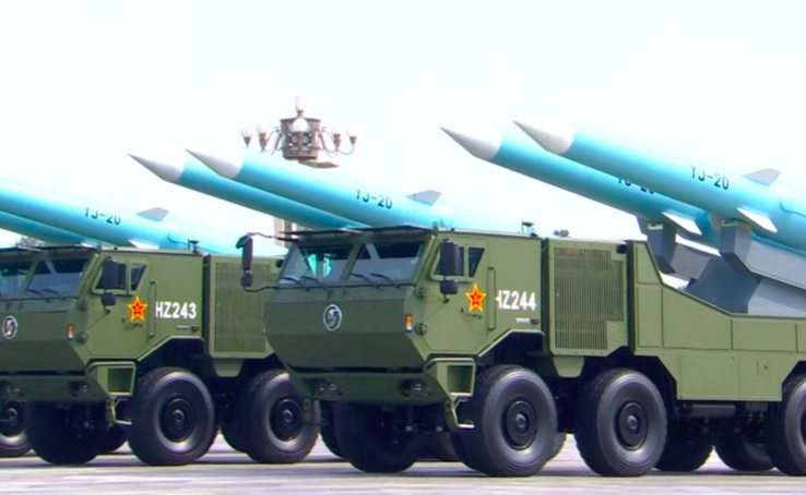 YJ-20,看上去跟之前在珠海航展亮相過的YJ-21導彈類似,外觀的區別是與掛在轟炸機上空中發射的YJ-21比,YJ-20多了一截助推器。這説明它可以從水面艦艇或者潛艇的垂直髮射裝置起飛,以極高的速度打擊敵方艦艇。