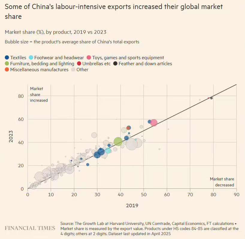 2. 如圖,哈佛大學增長實驗室彙編的貿易數據顯示,2019年至2023年中國在一系列勞動密集型行業中的全球出口份額有所增長。一個氣泡就是一個產業,橫縱座標分別是2019和2023年佔了全球份額,10%-60%常見。如果汽泡在斜線上方,就説明這個產業在2023年全球份額上升。掃帚、拖把和鋼筆等小型製成品的全球出口份額上升了9個百分點,達到52.3%。傢俱出口市場份額增長約1.5個百分點,玩具從54.3%上升至56.9%。