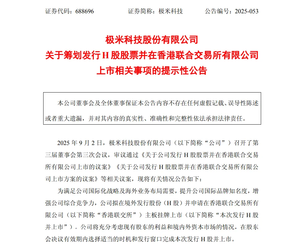 9月2日晚,極米科技公告,9月2日,公司召開了第三屆董事會第三次會議,審議通過《關於公司發行H股股票並在香港聯合交易所有限公司上市的議案》《關於公司發行H股股票並在香港聯合交易所有限公司上市方案的議案》等相關議案。極米科技表示,為滿足公司國際化戰略及海外業務佈局需要,提升公司國際品牌知名度,增強公司綜合競爭力,公司擬在境外發行股份(H股)並申請在香港聯合交易所有限公司主板掛牌上市,公司將充分考慮現有股東的利益和境內外資本市場的情況,在股東會決議有效期內選擇適當的時機和發行窗口完成本次發行H股並上市。截至目前,公司正積極與相關中介機構就本次發行H股並上市的相關工作進行商討,除本次董事會審議通過的相關議案外,其他關於本次發行H股並上市的具體細節尚未確定。截至9月2日收盤,極米科技(688696.SH)報128.90元/股,市值90.23億元。